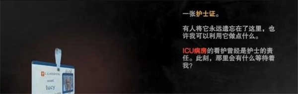 14、凭借护士证进入ICU病房,在特定位置找到绝缘手套,该装备会在后续与电力系统的交互过程中起到关键作用。