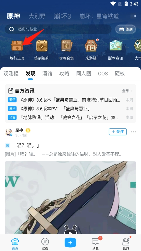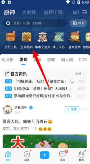 1、打开米游社,在首页点击左上角"原神"。
