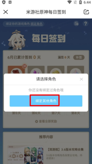 5、首次操作时,完成角色绑定后即可进入“米游社原神每日签到”活动页面,点击签到按钮完成签到,成功后将获得对应的奖励。