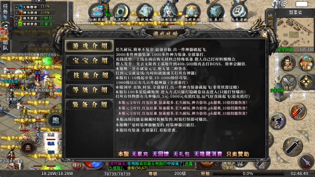 4、本服务器提供1到10级的起步装备,10级至1000级的倍攻装备,1000级之后还有数百件超神器,并且所有装备都需要通过打怪获取。
