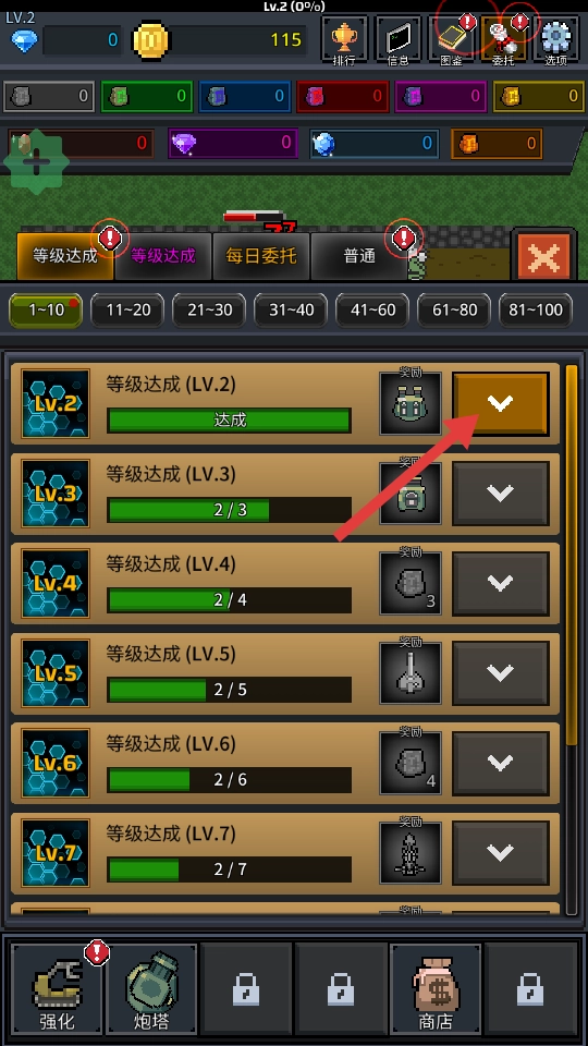 3、领取等级达成奖励,获取炮塔与资源,增强游戏实力,推动关卡进程。