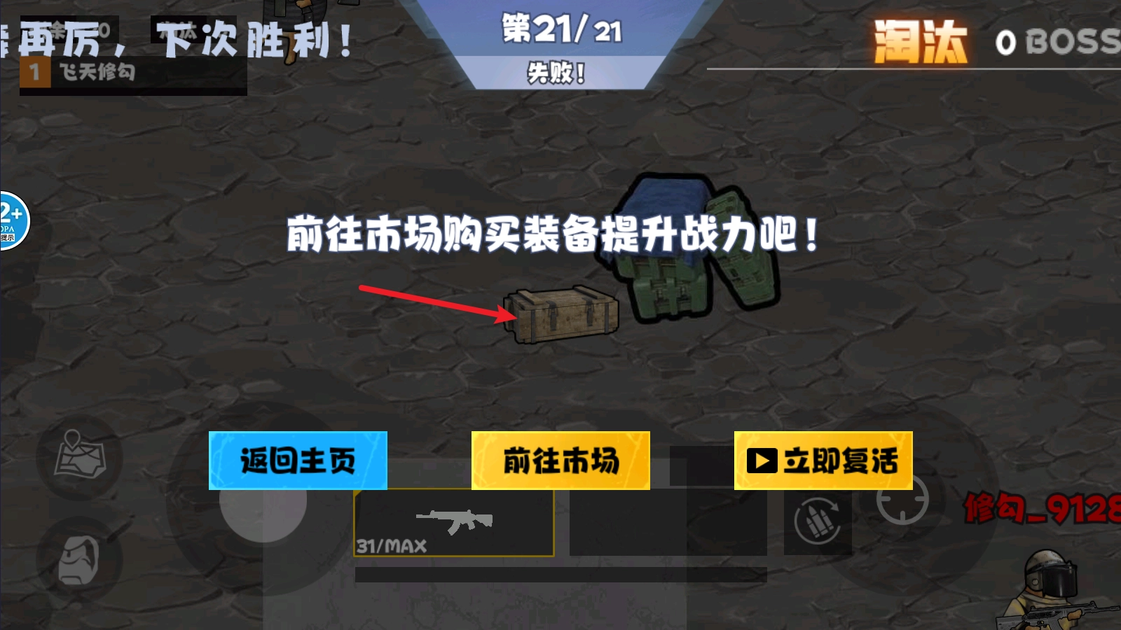 4、要是被其他玩家击倒,你就会变成盒子,此时可以选择复活,也可以选择重新开始。