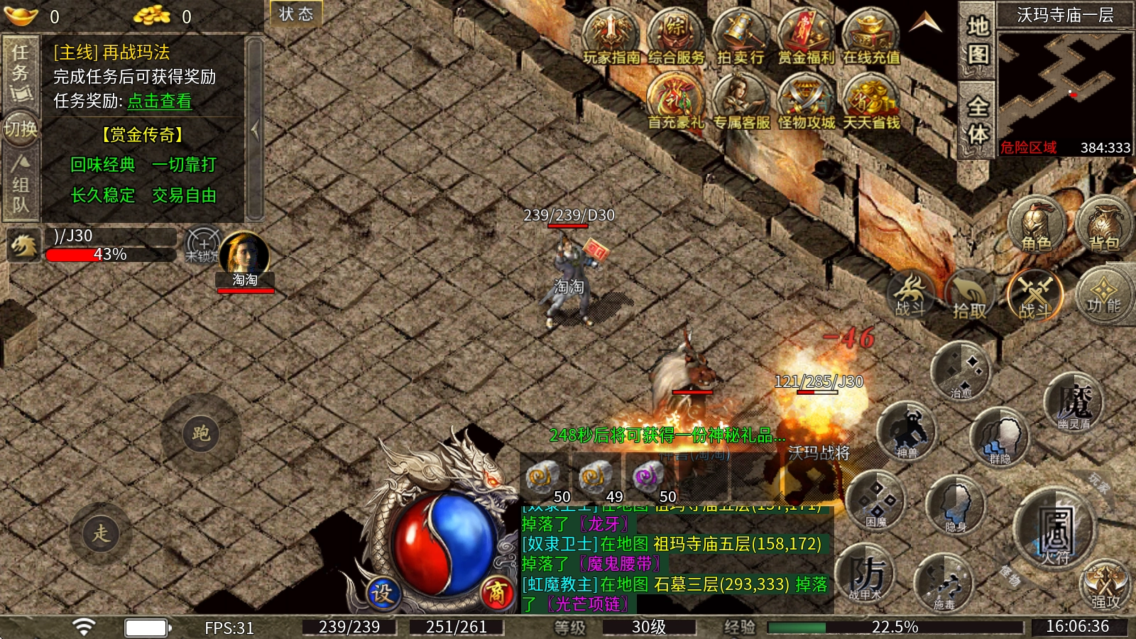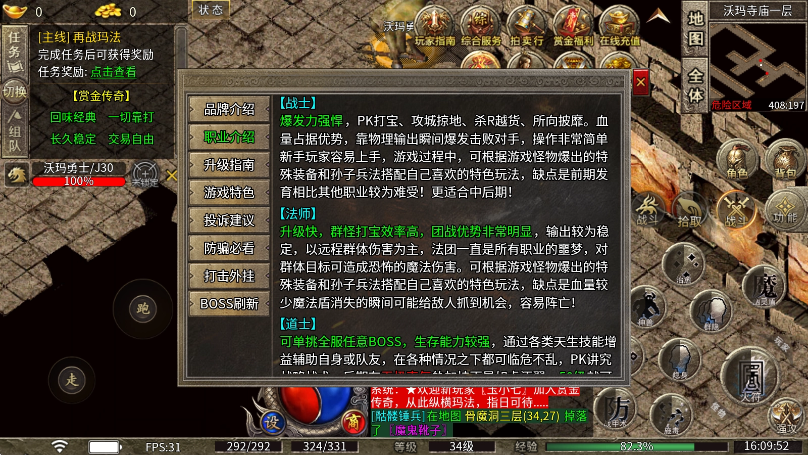 升级速度快,群怪打宝的效率很高,在团战中优势十分显著,输出也比较稳定,主要依靠远程群体伤害,法团向来是所有职业的噩梦,能对群体目标造成可怕的魔法伤害。可以根据游戏里怪物掉落的特殊装备,结合孙子兵法来搭配自己偏好的特色玩法。不过它的缺点是血量偏少,魔法盾消失的刹那可能会被敌人抓住机会,很容易阵亡!