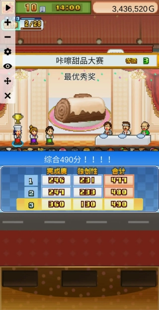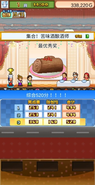 3、西城蛋糕会(满分完成度为480)和之前一样纯粹比拼三围数值,不过对美味度的要求更高一些,使用城镇大赛的配方就可以应对。