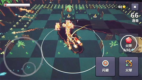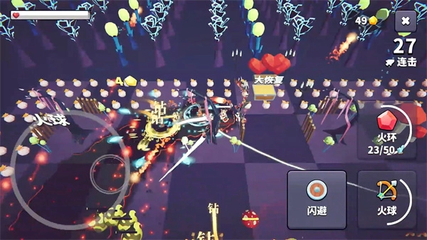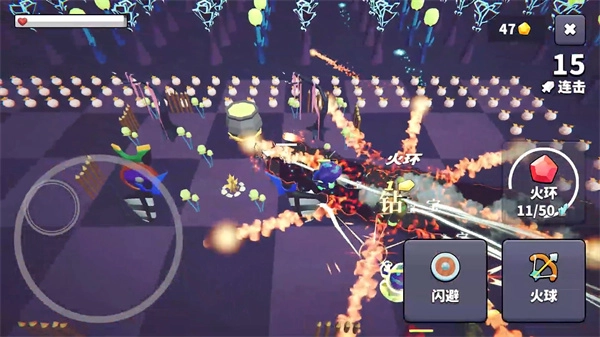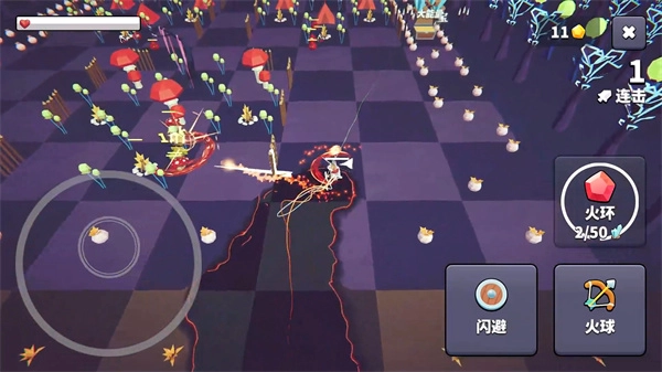 1、挑选一个关卡直接发起挑战,左下角的按键用于操控角色移动,右侧的按键分别对应闪避动作与火球技能。