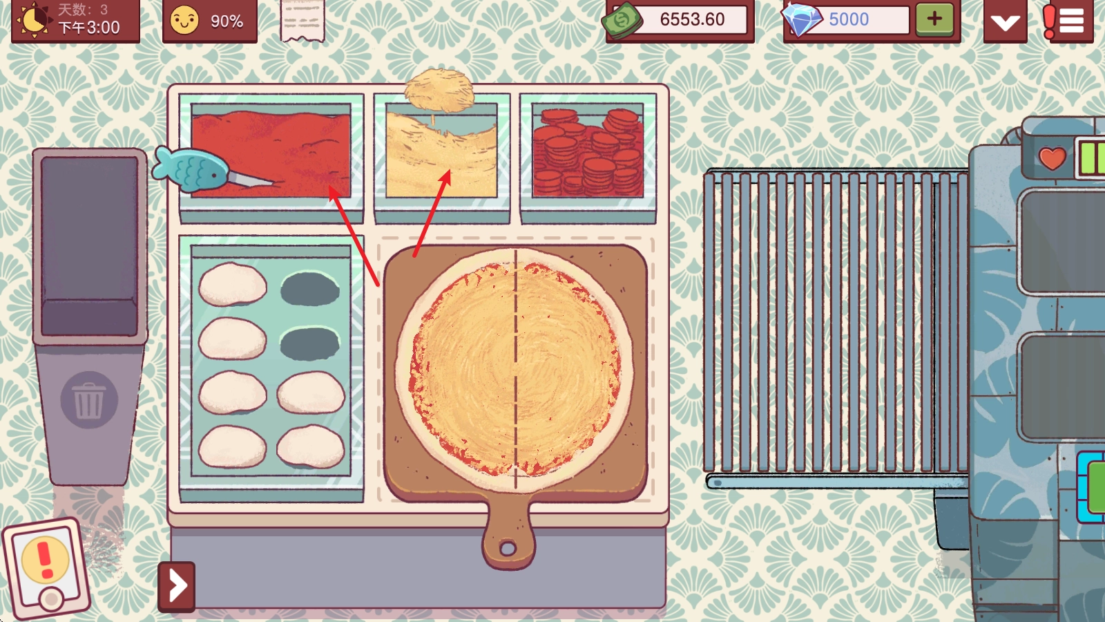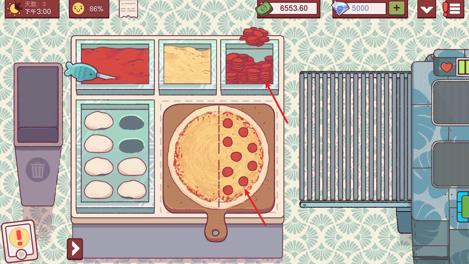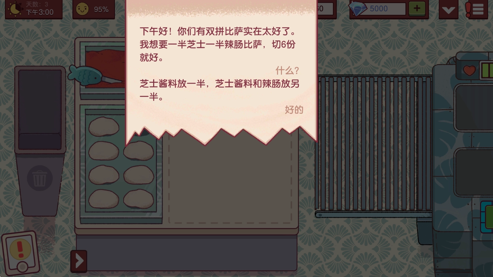 在游戏里,最重要的是认真查看客人的需求,只有这样才能做出合格的披萨,制作时要是忘了还能点击左上角的纸条再确认一下。