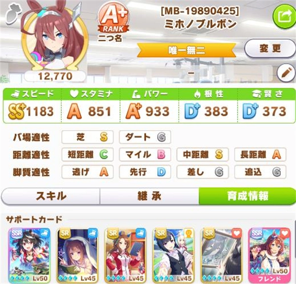 2、当玩家的速耐力卡每种都能凑出2-3张属性尚可的SR或SSR时,就差不多进入进阶阶段了。到了这个时期,通关URA对玩家而言已经是比较轻松的任务,马娘基本都达到觉醒3或更高等级,重心也慢慢转向竞技场或大赛。3速2耐1友的卡组配置,大体上能应对所有主流的中长距离赛道;速特速东商速光环都是相当出色的平民速卡,速荣进闪耀也挺好,更适合差马使用。