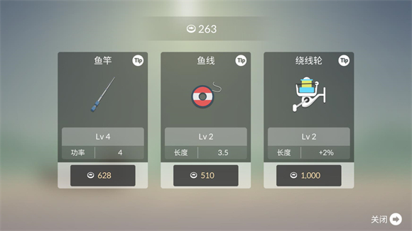 4、在界面点击升级按钮,消耗金币即可提升钓鱼设备的性能:升级鱼竿能让你钓到更高级别的鱼类,升级鱼线可帮助你垂钓更深水域的鱼,升级绕线轮则能增加钓鱼线的长度。