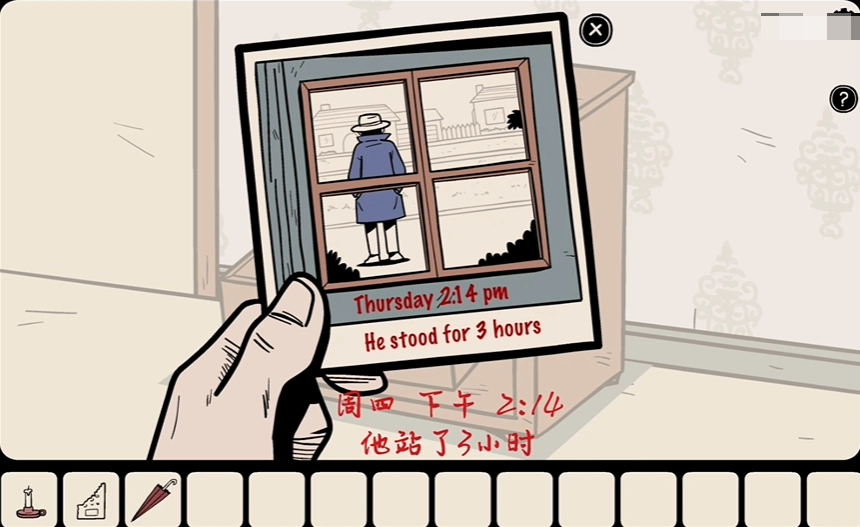 中间的抽屉里放着一张相片,相片上是一个身穿蓝色衣服、戴着帽子的男人,他在屋外背对着窗户站着。相片上还有一行字,写着“星期四下午两点十四分,他已经在那里站了三个小时了”。