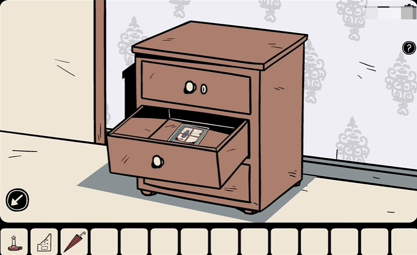 1、从门旁矮柜上取过蜡烛,同时留意到最上层的抽屉是锁着的状态。