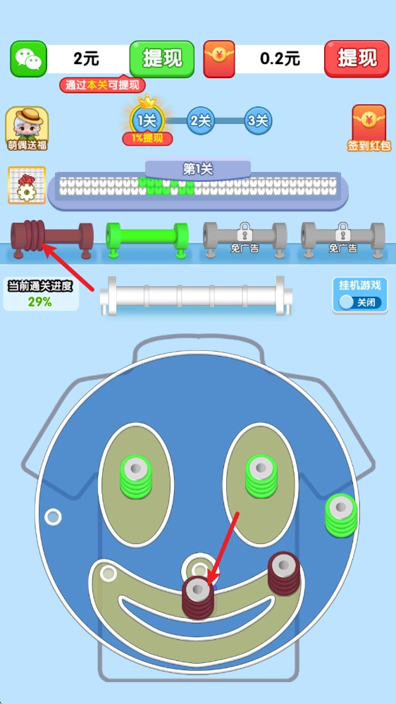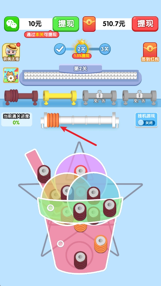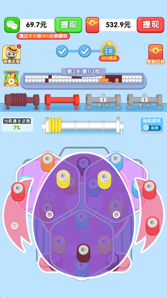 这款游戏在传统打螺丝玩法基础上做了创新,把消除方式换成了编织毛线——玩法本质其实没变,但体验起来新鲜又有趣,而且每通过一关就像完成了一件编织作品,特别有意思。