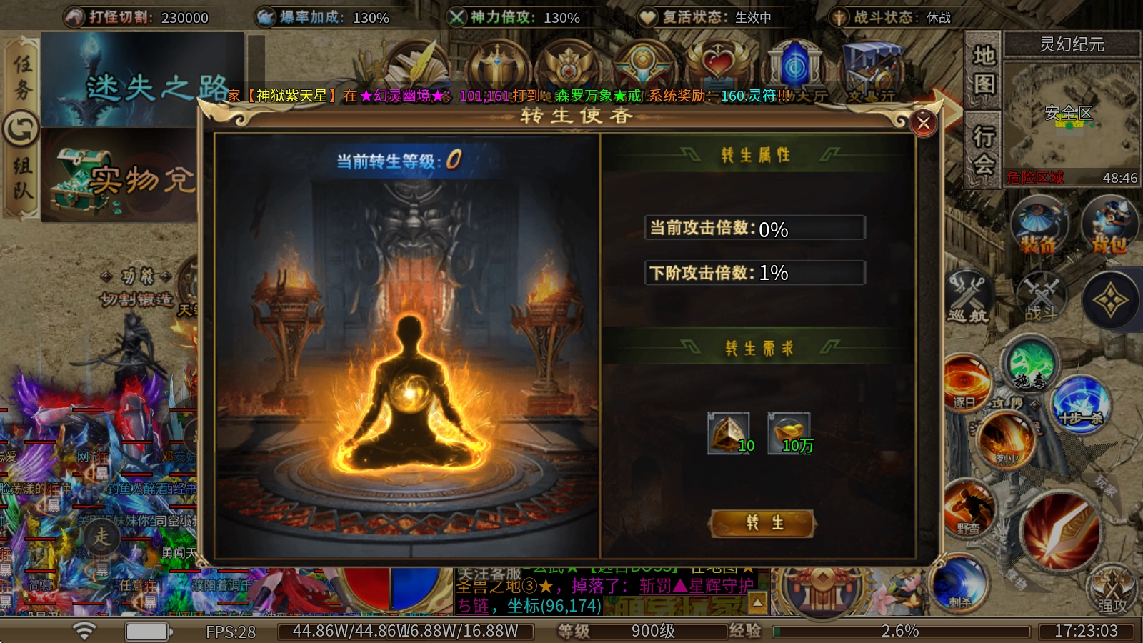 4、转生使者:需消耗永恒圣石与元宝进行提升,每提升一级都能获得神力倍攻的加成。