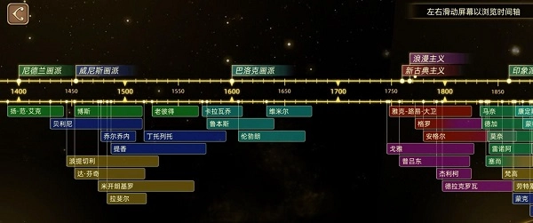 最令人称奇的是可以依据年代来查找流派、画家以及相关作品,所有信息都清晰明了,让人一眼就能看明白。