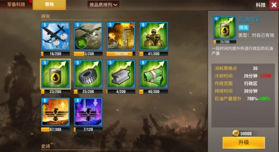 3、和科技系统比起来,策略的优先级要稍低一些。平民玩家建议优先把资源投入到提升科技等级上,要是还有多余的精力,可以有针对性地强化一部分实用策略,以此来增强实战能力。