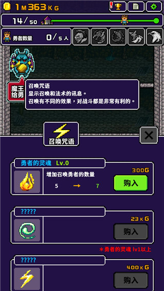 2、点击召唤咒语,能够解锁各类咒语,提升召唤勇者的数量