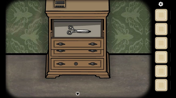 柜子上放着一台录音设备,看样子是用来播放磁带的。旁边摆着打字机和一盆植物,用剪刀能剪下它的叶片。靠近门口的地方还有个开关,把灯打开后,能在灯罩里面找到一张照片的碎片。