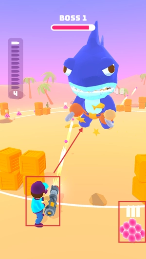 1、控制角色在场景里移动、瞄准并射击,持续攻击面前的BOSS角色,把它的血量打空来完成关卡挑战。