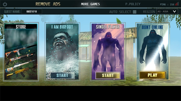 《大脚怪狩猎》多人联机版是以经典都市传说中的大脚怪为原型打造的第一人称微恐怖射击游戏。在游戏里,你将开启捕猎大脚怪的冒险——这些神秘生物拥有极快的移动速度与惊人的肌力,你需要在阴森诡异的森林中展开探索。各类武器装备能为你提供有力辅助,丰富多样的特色挑战模式支持你自由设置规则,凭借精准操作扭转战局。你可以运用陷阱道具与威力强大的枪械,和好友组队协作战斗,将这些奇特怪物全部捕获用于研究;还能布设巧妙的陷阱来牵制大脚怪,为完成任务充分利用各类道具与资源,练就百发百中的枪法!