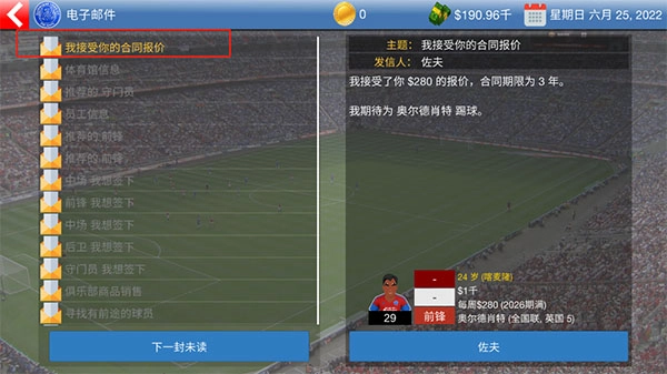 5、最后在收件箱中查看,若球员接受报价,即表示购买成功。