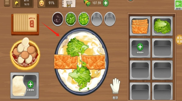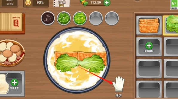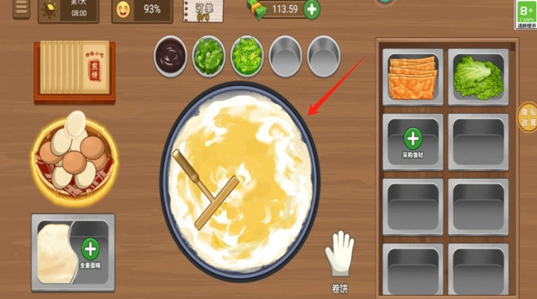 1、首先你需要点击采购食材将煎饼摊的空白处都填满