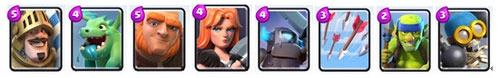 这套卡组的核心推进单位是王子,搭配巨人和迷你皮卡能够实现快速破塔;不过卡组存在圣水消耗偏高的问题,导致出兵速度较慢,转换进攻或防守节奏的能力较差,只有在圣水加速阶段才能充分发挥出它的优势。