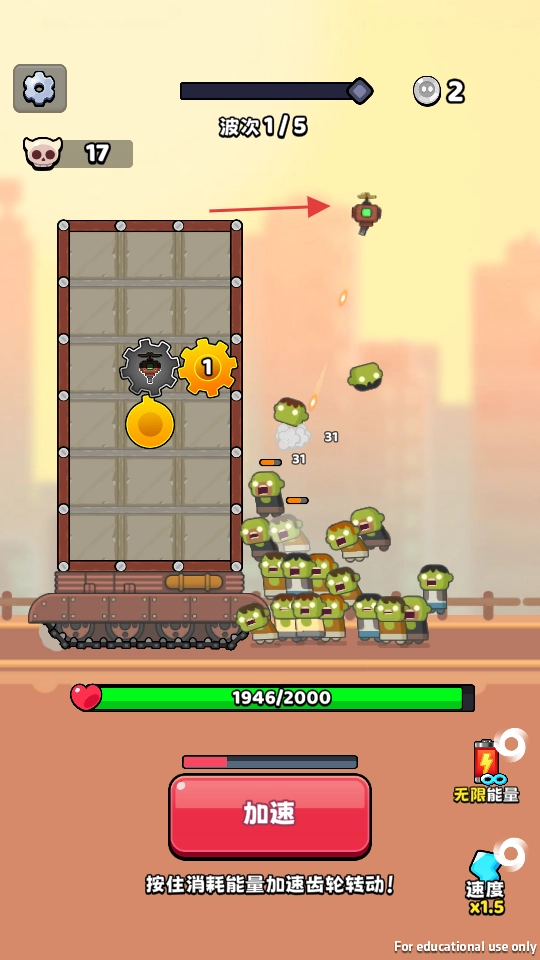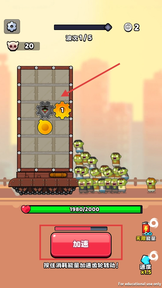 2、遭遇僵尸群时,按住【加速】键会消耗能量,让齿轮转动速度加快,从而提高攻击和防御的效率,以此来守护基地。