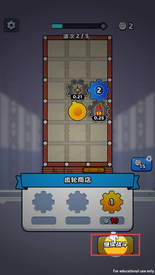 4、完成波次【2杠5】后,点击【继续战斗】开启下一波次,使用银币购买新齿轮来强化防御。