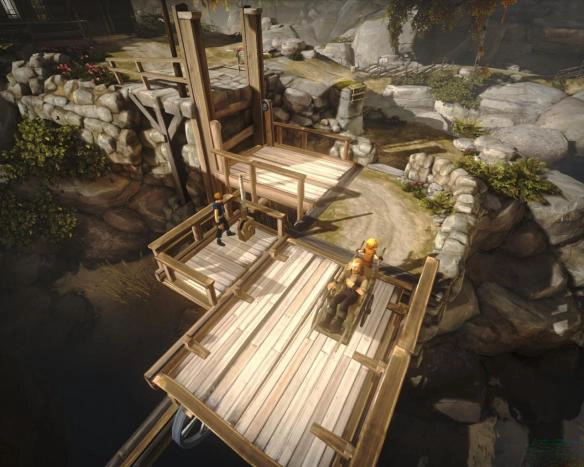 1、游戏开始后,顺着小路走到桥梁附近,会碰到一个简单的谜题。这里弟弟力气不够,得让哥哥帮忙扳动把手。接着往右走,来到一段断梯的下方,哥哥要把弟弟举起来,再由弟弟放下绳索,让哥哥攀爬上来。最后两人一起操作升降机的把手,继续向前行进。(需两人协作完成)