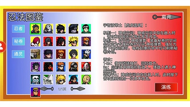 3、进入【图鉴】界面,该页面会详细呈现每位忍者的技能属性、秘卷效果以及通灵兽的相关信息。