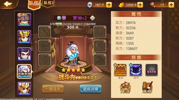 贾诩属于稀有武将范畴,想要得到他的难度不小。他的第一个技能,能在我方先手时,让全体武将获得两回合的物理免疫效果,同时具备法术反弹和物理反弹的能力,还能使全体速度提升20%。第二个技能则可以让自身免疫疑心和离间这两种状态。当贾诩达到金色品质后,会额外增加首回合锁血的效果,并且速度再提升50%。他既有不错的坦度,又拥有出色的辅助能力,是当前版本里非常强势的武将之一。不过他的不足之处也很明显,那就是获取过程比较艰难,而且元神的产出量也比较低。
