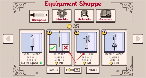 2、在装备商店里,你可以用金币购买武器、盾牌、头盔、盔甲之类的装备,以此增强角色的战斗能力。