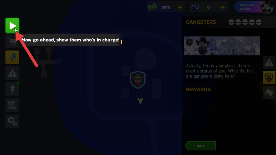 1、点击绿色的开始按钮,进入游戏界面,开启与黑帮对抗的战斗。
