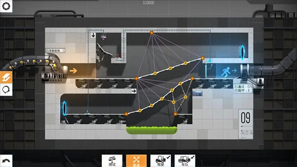 量子隧道关卡。此关新增了传送门装置,同时解锁了全新的建筑材料——钢索。通关的方法是:先在岩浆上方搭建一层桥面并完成硬化处理,接着在楼板的建筑点位上,通过钢索将其与桥面的连接点相互连接,这样就能顺利过关了。