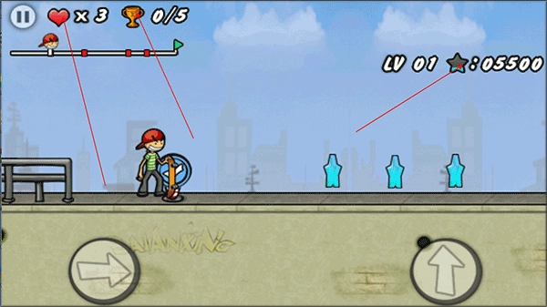 1、安装好滑板小子这款游戏后,启动它。游戏界面左侧的方向键用来调节角色的移动速度,右侧的按键则是用来进行跳跃动作的。