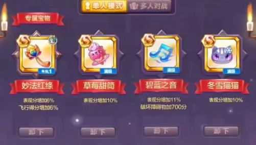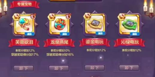 1、第一种宝物搭配方案:妙法红绦、草莓甜筒、碧蓝之音、冬雪猫猫。这套搭配的核心思路是借助第一个宝物的满级属性“飞天玄女”来冲击更高分数。