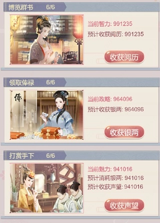 在内政玩法里,各位小主能做的事有三件,分别是博览群书、领取俸禄和打赏手下。