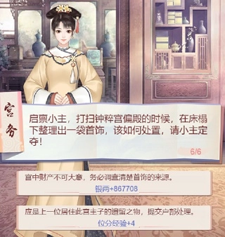 每日都能完成若干宫务任务,可处理的宫务次数会随时间自动恢复。宫务任务里设有不同选项,既有随机出现的资源类选项,也有固定的位分经验选项,小主们可依据自身需求灵活选择。若使用宫务令,能立即恢复一次处理宫务的机会,该道具可通过慎刑司玩法获取。