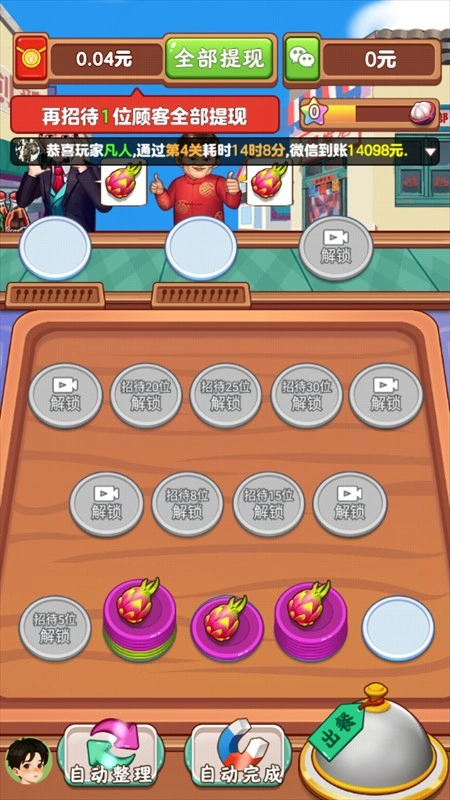 3、把菜品交给外卖员后,游戏流程就走完了。另外,我们通过对应关卡还能解锁红包,达成相应目标就能提现。