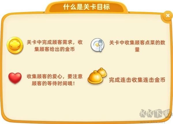 1、金币:指的是金币关卡。玩家需要完成顾客提出的需求,收集顾客支付的金币,最终达成目标营收金额。