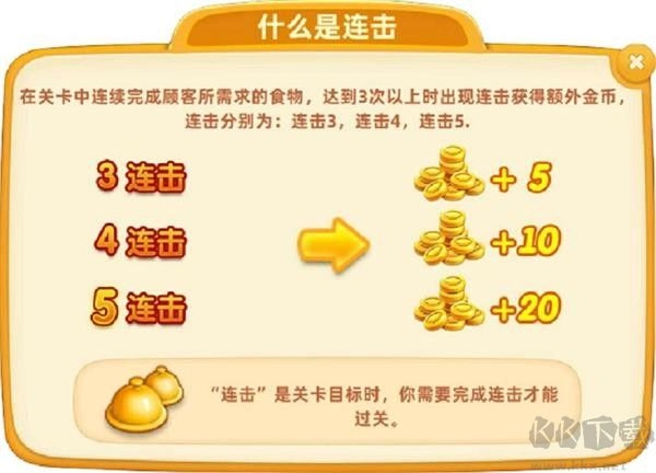 连击机制要求大厨在关卡内连续完成顾客点单的食物,当连续上菜次数达到3次及以上时触发连击并获得额外金币(连续上菜2次及以下不计入连击统计)。该机制的最高连击数为5连击,触发后可额外获得20金币奖励。