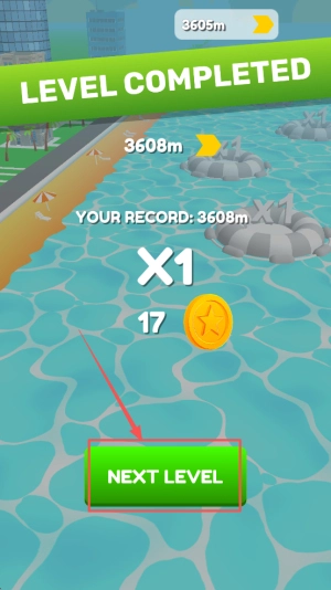 4.完成关卡:当画面显示“LEVEL COMPLETED”并刷新你的纪录(如“YOUR RECORD:3608m”)时,点击“NEXT LEVEL”进入下一关。