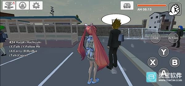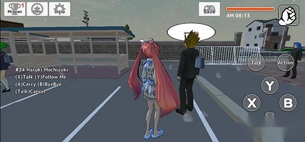 5、这里以“去学校”为例,和其他同学们打个招呼,靠近后点击“talk”,左下侧就会显示,X是聊天、Y是要求对方跟随、A是携带对方、B是再见,可以自由选择。