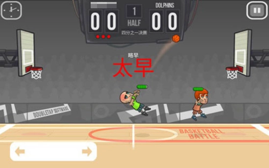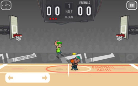 2、屏幕左下角的两个箭头用于操控角色移动,手指按住屏幕右侧空白区域可实现角色跳投。但跳投时需留意,当主角跃至空中时必须松开手指,否则角色无法将篮球投出。