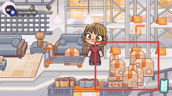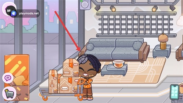 2、操控角色推动搬运车,移动至堆放货物的区域,靠近待搬运的箱子。