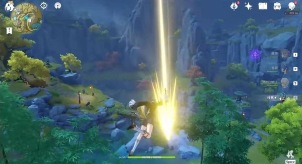 在挖稀有矿时,如果你的队伍没有大剑(双手剑)角色,换角色又很麻烦,用单手剑或者长枪又要打很久,这时你可以利用下落攻击,这样通常2-3次就可以击碎矿石,虽然《原神》不能在平地跳跃起直接下落攻击,但是矿石通常都出现在靠边的地方或者有斜度的地方所以一定有办法使用下落攻击。