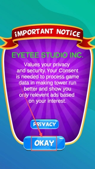 1.启动游戏:打开游戏后,阅读隐私说明并点击“OKAY”按钮进入主界面。