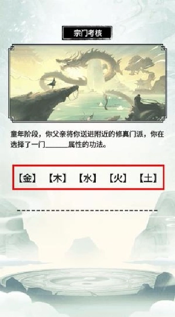 2、u200cu200c在童年阶段参与宗门考核,从金、木、水、火、土等属性中选择一项功法,奠定后续修炼方向基础。