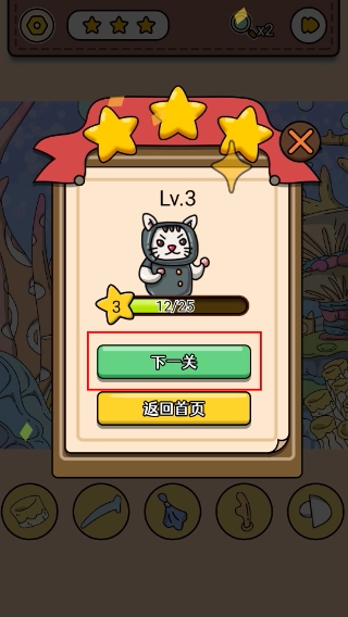 4、关卡结算时点击【下一关】按钮,继续挑战更高难度关卡,提升角色等级与装饰完成度。