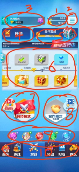 当新手按照《球球英雄》的引导流程操作时,首先映入眼帘的就是这个初始界面。我把界面内容拆解成了10个板块,接下来会逐一为大家讲解每个板块的具体信息。