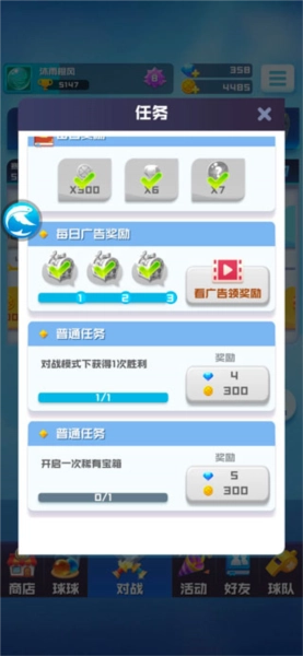 在《球球英雄》的任务系统里,每天有四个可完成的日常任务,完成后能拿到钻石和金币奖励;此外还有每日登录奖励,不过得手动领取才行。另外,这里还有三个看广告就能获取的箱子,打开后的样子就是这样的。需要特别说明的是,任务界面里其实只有三个任务栏,但每个玩家每天却能完成四个任务。具体操作是:当你完成一个任务后,任务栏后面会出现一个旋转箭头,这是刷新按钮,点击刷新就能得到一个新任务,而且每天只能刷新一次哦。